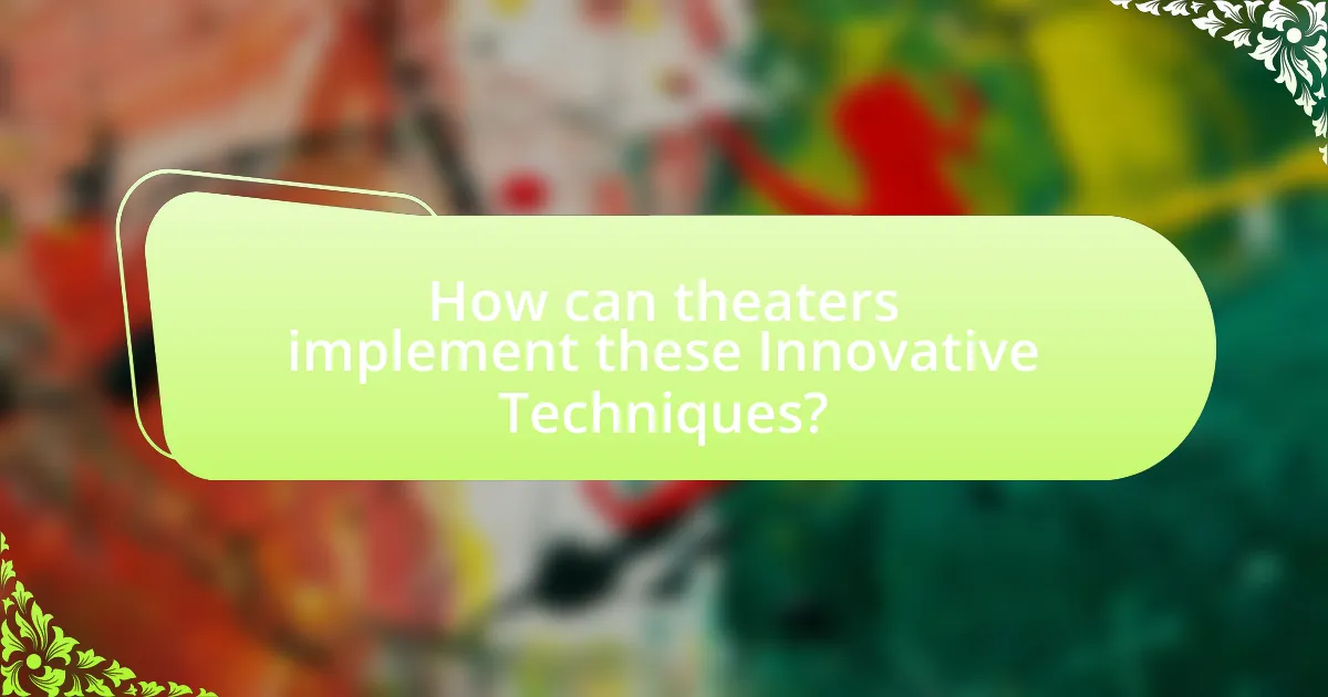 Theaters can implement innovative techniques by integrating technology, enhancing audience interaction, and diversifying programming. For instance, theaters can utilize augmented reality (AR) and virtual reality (VR) to create immersive experiences, as evidenced by productions like “The Lion King” which incorporated AR elements to engage viewers. Additionally, interactive performances, where audiences can influence the storyline, have been successfully executed in shows like “Sleep No More,” allowing for a more personalized experience. Furthermore, diversifying programming to include various genres and formats, such as live-streaming performances or hosting community events, can attract a broader audience base, as demonstrated by the success of the National Theatre’s NT Live series, which expanded their reach beyond traditional theatergoers.